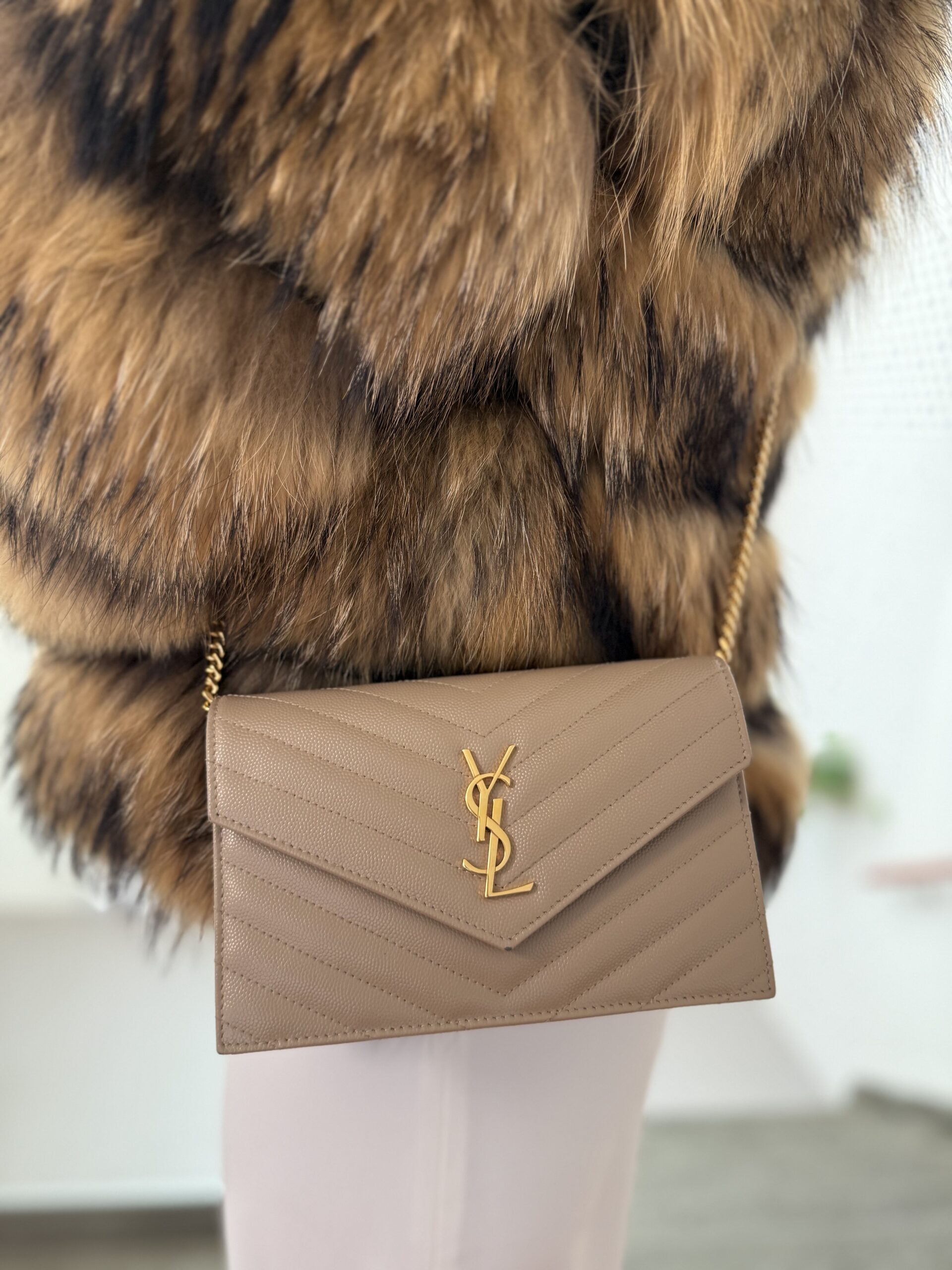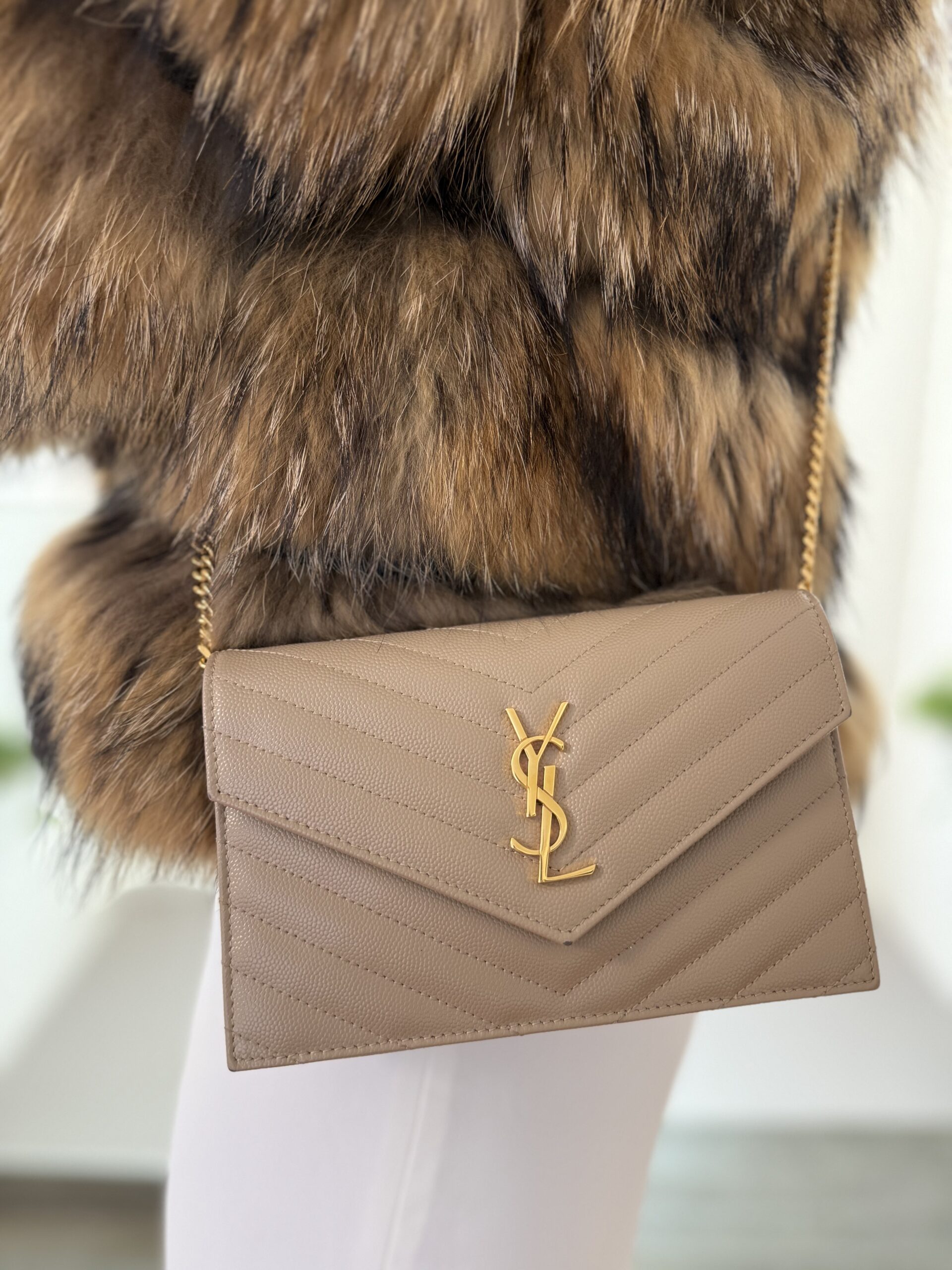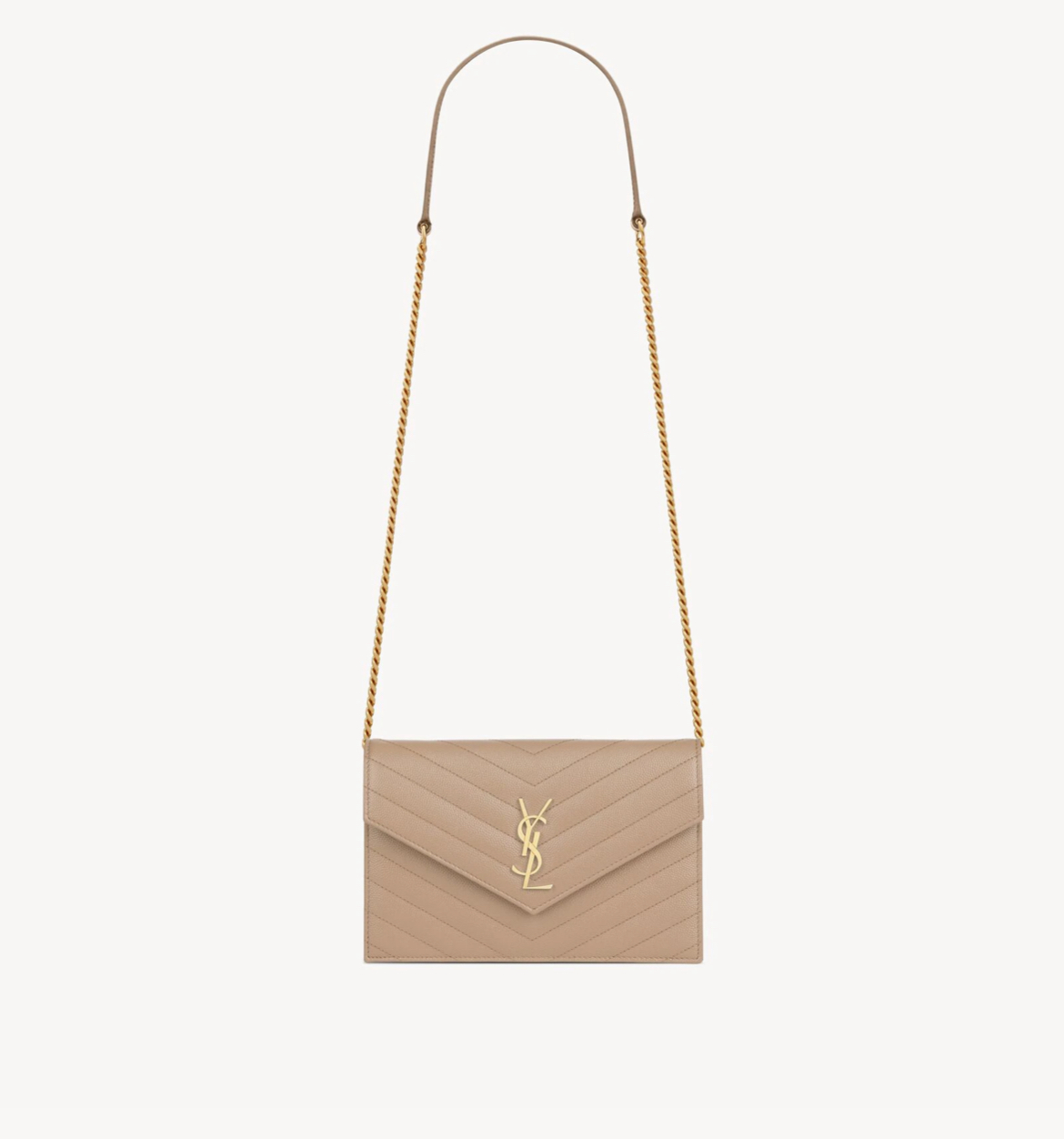 Saint Laurent Cassandre Envelope Chain Wallet Poudre – Zlatá elegance v kompaktním provedení